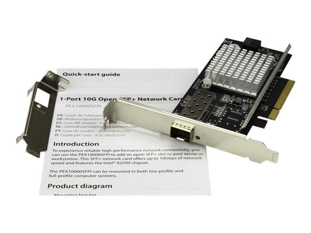 - Information Get advanced connectivity over multimode or single-mode fiber, by adding a 10GBase-LR/SR open SFP+ port to your server or workstation. This fiber network card delivers reliable, high-performance network connectivity, by adding an open SFP+ slot to your server or high-powered workstation. It provides an easy and cost-effective way to upgrade your server or workstation to a 10 Gigabit fiber network using the SFP+ module of your choice and gives you the flexibility to use either multimode or single-mode fiber. Several factors drive the need for more bandwidth in your network infrastructure. An increase in the number of network users and data-intensive applications, such as multimedia streaming and large file transfers all contribute to the need for more bandwidth in your network infrastructure. This fiber NIC lets you take advantage of the increased speed and stability of a 10 Gigabit network, with data transfers of up to 10Gbps. The fiber NIC is compatible with most 10GbE SFP+ transceivers. This gives you flexible and scalable configuration options for connecting your computer directly to a fiber network, at greater distances. The card features an open SFP+ slot with support for one interchangeable 10GBase SFP+ module. This gives you the option to use the fiber transceiver module that best suits your network needs based on distance and connector type. StarTech.com offers a variety of SFP+ transceiver modules including the SFP10GLRST single-mode SFP+ the SFP10GLRMST multi-mode SFP+, and SFP10GSRST multimode LC with DDM. In addition, StarTech.com SFP+ Cables provide a dependable solution for linking telecom and data communications equipment, such as routers and switches. The 10 Gigabit network card features the Intel 82599 chipset, delivering the power, performance and enhanced capabilities you need for reliable network connections to your server or computer. The Intel chip offers many advanced features including Intel Virtualization Technology for Connectivity, PXE network boot support and up to 15K jumbo frame support.